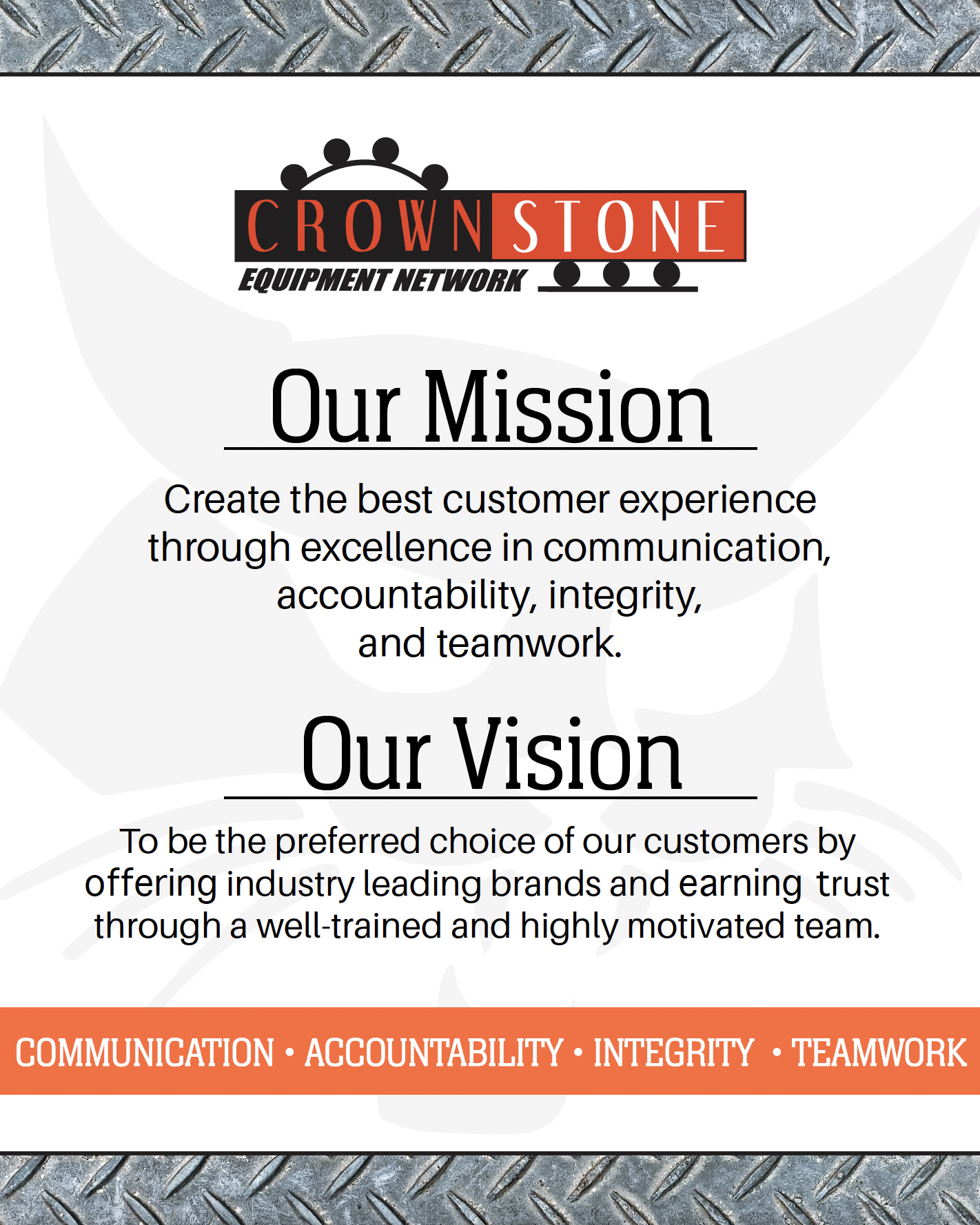 At Crownstone Equipment, we pride ourselves in putting our customers first. That’s why everything we do is guided by our mission, vision, and values!