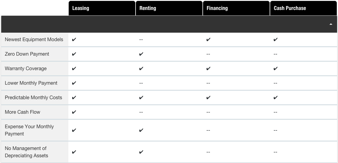 Leasing is a short-term commitment with predictable costs that allows you to get low monthly payments and the newest equipment.